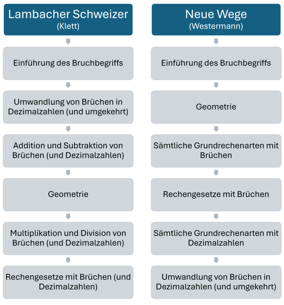 Während der Lambacher Schweizer zunächst nur Addition und Subtraktion von Brüchen behandelt und Multiplikation sowie Division auf ein späteres Kapitel verschiebt, werden bei den Neuen Wegen sämtliche Grundrechenarten im Block abgearbeitet. Da einer der Hauptschwierigkeiten der Schüler in der Unterscheidung besteht, wann bei zwei vorliegenden Brüchen diese auf einen gemeinsamen Nenner gebracht und wann Zähler sowie Nenner jeweils getrennt voneinander behandelt werden dürfen, ist letzteres Vorgehen entschieden sinnvoller.